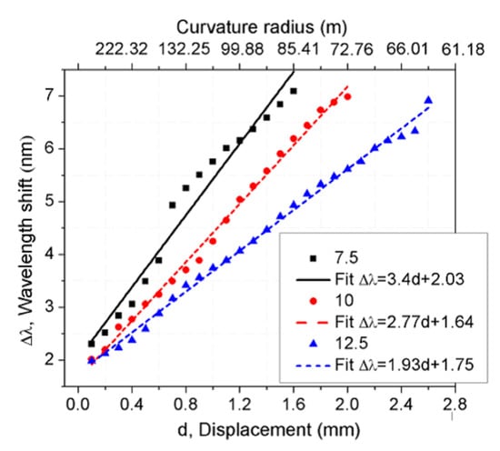 For L values of 7.5, 10, and 12.5 cm, the wavelength shift of the OFMI output spectrum as a function of the mechanical displacement and curvature radius (m) is shown in Figure 7. The corresponding curvature radius for each displacement position is indicated at the top of the graphic. The response of the three different SMF lengths exhibits an approximately linear behavior. The linear fitting of the experimental data can be fitted by the following equations: