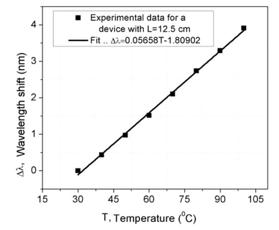 As the effect of temperature is an important parameter to be considered in sensor performance, the OFMI was exposed to temperature changes. An OFMI with an SMF length of 12.5 mm was positioned on a hot plate when it was bent to a bending radius of around 48,208 mm, and a spectral shift of 3.7 nm to larger wavelengths with negligible visibility change was observed as the temperature increases from room temperature to 100 °C. Figure 8 shows the wavelength shift versus the temperature of this OFMI with a length of 12.5 mm; the wavelength shift increases in a linear way with a factor of ~0.05658 nm/°C. As the OFMI is sensible to temperature changes, temperature perturbations can alter the sensor bending measurement. However, this can be avoided by maintaining the sensor in a temperature-controlled environment.
