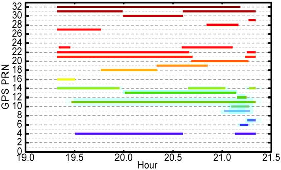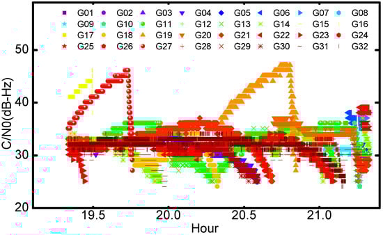 As shown in Figure 1, during the return periods, the receiver was able to acquire and track at least 22 GPS satellites. In most of time, the signals from eight GPS satellites were tracked simultaneously. The length of continuous tracking periods of four GPS satellites are near two hs, for instance Pseudo Random Noise (PRN) G11, G21, G22 and G32.