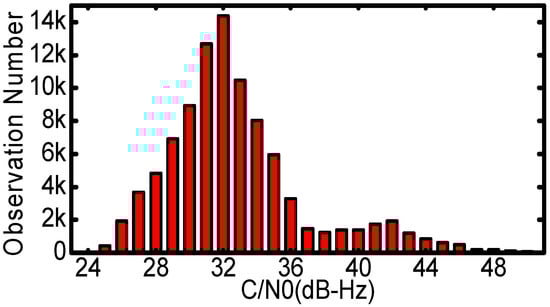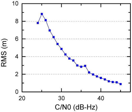 In addition, to analyze the relationship between code errors and C/N0 values, the Root Mean Squares (RMS) values of C1 code errors as a function of C/N0 are shown in Figure 8. We can see that the precision of C1 observations is better with C/N0 values increasing. The C1 code errors reach to as large as 10 m when C/N0 gets close to the lower limit of the receiver sensitivity. For C/N0 larger than 30 dB-Hz, the C1 observation errors are better than 5 m. The overall precision of C1 code errors is 4.15 m.