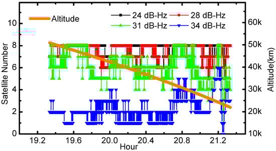 The C/N0, an important indicator of GNSS receiver design, would affect the number of visible satellite. Figure 4 shows the number of visible GPS satellites with respect to spacecraft altitude and different C/N0 thresholds, and only the GPS observations with C/N0 values larger than the threshold are utilized in calculations. The C/N0 thresholds are set as 24, 28, 31 and 34 dB-Hz, respectively. During the returning experiment arc, the altitude fell from 50,000 km to 20,000 km. The average number of tracked GPS satellites is 7.8 when the threshold of 24 dB-Hz is taken into account. Increasing the signal tracking threshold to 31 dB-Hz, the average number decreased to 6.1. Finally, an increase of the threshold from 31 dB-Hz to 34 dB-Hz witnessed a significant decrease of the average number of visible GPS satellites to 2.2.
