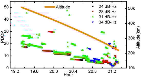 PDOP reveals the geometry strength between the receiver and GNSS transmitters. Usually, small PDOP value indicates good geometry condition. The PDOP variations against different C/N0 thresholds are also investigated and shown in Figure 5. Since the PDOP could only be derived with simultaneously tracked signals from at least four GPS satellites, the threshold of 34 dB-Hz led to quite few results, most of which were near the earth. When the C/N0 thresholds are set as 31 dB-Hz and 34 dB-Hz, the PDOP values can even reach over 50 in some epochs and thus are not displayed in the plot. For the case of Chang’E-5T, the PDOP values are greatly affected by the altitudes. The main reason is that GPS satellites can be observed with better spatial distribution from the receiver antenna when the spacecraft is in the lower altitudes, indicating better geometry condition.