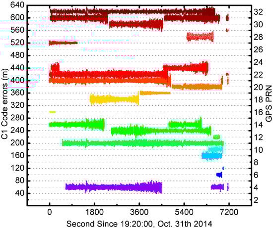 The times series of C1 code errors for all GPS satellites (unit: meter). The values of each satellite have been offset 20 m for clarity. The different colors represent different satellites, and the colors are the same as Figure 1.