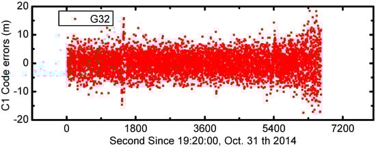 The C1 code errors for all GPS satellites are calculated and shown in Figure 6. In the figure the C1 code errors are shifted by 20 m from one to another. The code errors are mainly between ±10 m and show consistent variations during the entire 2 h. In order to show more details of onboard GPS code measurement errors, we also plot the times series of C1 code errors for G32 satellite in Figure 7. The mean value and standard deviation of G32 code errors are 0 m and 3.92 m, respectively.