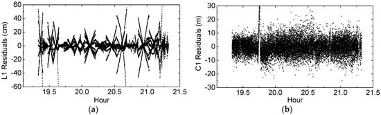 (a) L1 observation residual series (unit: centimeter); (b) C1 observation residual series (unit: meter).