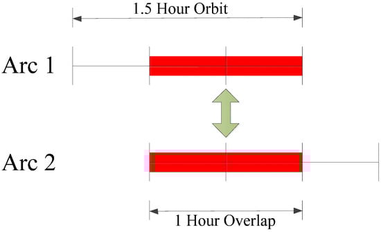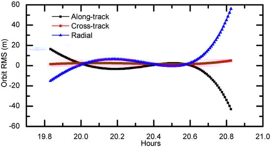 To evaluate dynamic orbit, we first separate the 2-h GPS data into two 1.5-h arcs with a 1-h overlap, as shown in Figure 10. These two arcs are processed with the same OD strategy presented in Section 3.1, and their orbit differences during the overlaps are calculated in along-track, cross-track and radial components and are used as indicators of the orbit quality. The overlap comparison here can reveal the internal consistency of the orbit estimates. Figure 11 shows the 1-h overlap differences. The differences in along-track and radial components are mainly within ±20 m but show larger discrepancies in the last 10 min. Comparatively, the orbit differences in cross-track component are much smaller. The RMS errors in along-track, cross-track and radial direction are 10.60 m, 2.26 m and 13.89 m, respectively. This indicates that the orbit consistency using the OD scheme presented in Table 2 should be at this precision.