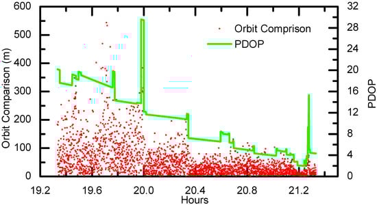 The kinematic orbit of Chang’E-5T is also calculated in this study using the C1 code ranges by SPP approach. The differences between the kinematic orbits and the dynamic orbits can also reveal the quality of the orbit solutions. Ideally, the dynamic orbits are considered of higher accuracy as the carrier-phase observations are used in addition to the code ranges. Their differences are depicted in Figure 12. As shown, the differences show significant correlations with respect to the PDOP values, which is dominated by the spacecraft altitude. The kinematic orbit precision is roughly at 90 m level on average and can reach 50 m when the altitude reaches 20,000 km. This precision is consistent with the results from [28], which were obtained by OD using C1 code ranges combined with ground-tracking measurements.