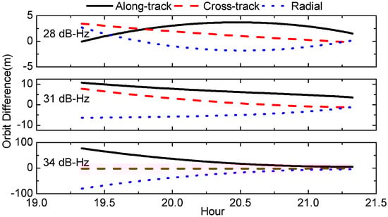 In this section, we investigate the Chang’E-5T OD precision with different C/N0 thresholds, and the resultant orbits are compared with dynamic orbits. The orbit differences in along-track, cross-track, radial components are shown in Figure 13 and their RMS are listed in Table 3.