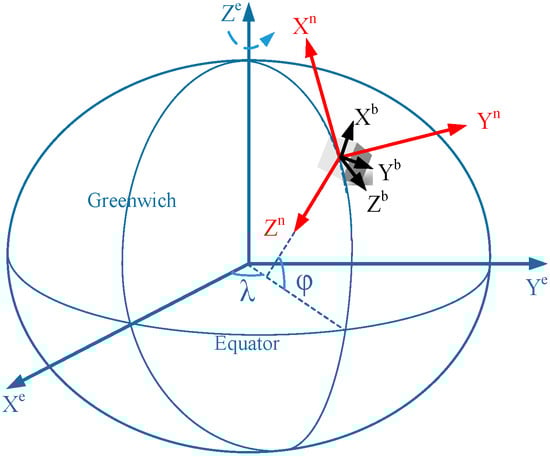 - The n-frame is the navigation frame. In this research, the NED frame is selected as the system navigation frame (n-frame). The x-axis (N) points towards the ellipsoidal North, and the z-axis is orthogonal to the reference ellipsoid and points downwards (D). The y-axis completes the right-handed orthogonal frame, thus pointing towards East (E).
