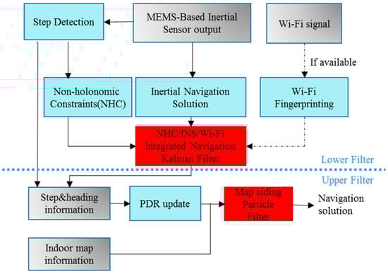 where is the measurement vector, which is the true velocity/position (NHC velocity/Wi-Fi position) of the system minus the velocity/position vector derived from INS during the NHC/Wi-Fi update. is the measurement noise matrix. The measurement matrix is . Everytime the state error is updated, the errors are applied to the INS navigation solution; then, is reset, which means the error state prediction procedure is no longer required. The complementary characteristics of MEMS sensors and Wi-Fi enable an efficient integration for indoor navigation applications. Thus, if a Wi-Fi signal is available, we estimate a more accurate INS solution from the lower filter. Subsequently, the number of particles used in the upper filter decreases, which can indirectly increase the computational speed of the system. However, if no Wi-Fi signal is available, an indoor map is still the main auxiliary information of the system.
