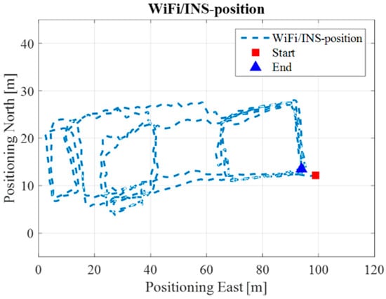 Figure 9 is the INS/NHC derived position without auxiliary Wi-Fi position or map information for the test in the ENG building. If we compare Figure 7 with the reference trajectory in Figure 6, it is evident that INS-alone system cannot provide realistic estimated position solutions, even with the NHC velocity constraint. The reason for this is when the velocity is used to correct the system error, the heading of the system is unobservable, which is also confirmed by the observability analysis conducted in [32]. Therefore, aiding information is needed to further correct the error of the system.