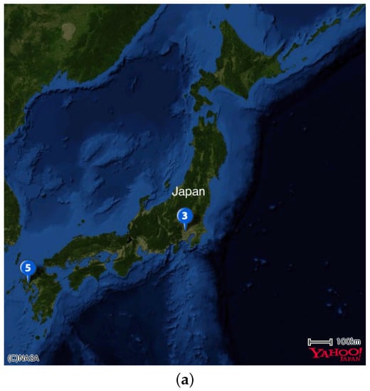 Location map of experimental sites and sensor setups (Pin1: tanashi-117; Pin2: tanashi-118; Pin3: sensor measuring reference air temperature for Tokyo site; Pin4: sagatea-111; Pin5: AMeDAS in Saga site). (a) Experimental sites in Japan; (b) sensor setup in Saga; (c) sensor setup in Tokyo.