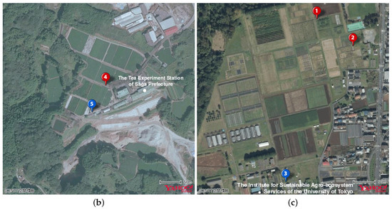 The experimental sites and sensor setups are shown in Figure 3. We installed one sensor node in the Tea Experiment Station of Saga Prefecture ( N and E) and two sensor nodes in the Institute for Sustainable Agro-ecosystem Services of The University of Tokyo ( N and E; N and E). Hereinafter, these locations are denoted as sagatea-111, tanashi-117, and tanashi-118, respectively. Since AMeDAS is also installed at the Tea Experiment Station ( N and E), we used the air temperature measurements from AMeDAS as reference data. The AMeDAS data were supplied by MetBroker [8]. At the experimental site in Tokyo, air temperatures measured by sensors installed at N and E were used as reference data. The sensors at the experimental site in Tokyo do not have a forced aspiration system, but are installed in Stevenson screens to shield them from direct sunlight while allowing natural air circulation by shelters made of wood in a double-louvered design (Figure 4).