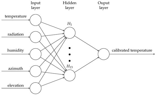 A three-layer backpropagation artificial neural network (ANN, Figure 5) was used to consider the multiple environmental factors that affect low-cost air temperature sensors. The hidden layer had 13 neurons with the weight decay of 0.1, which were determined by 10-fold cross-validation of datasets obtained at each location. The input data were the air temperatures measured by the low-cost sensor, humidity, solar radiation, azimuth and elevation. The solar radiation (“SP-215”, Apogee Instruments, Inc., Logan, Utah, USA) and humidity (“SHT-71”, Sensirion AG, Staefa, Switzerland) sensors were connected to the sensor nodes, while the solar azimuth and elevation were based on the latitude and longitude obtained by the GPS units on the sensor nodes. Linear regression-based calibration was also conducted to compare the performance of our method with that of a conventional method. All calculations were conducted using R Version 3.3.3 (R Core Team, Vienna, Austria) [30]. Source codes developed for this research are available online [29].