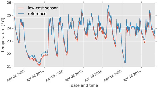 Figure 6 shows the indoor air temperatures measured by the low-cost and reference sensors obtained from the indoor experiment. The MAE was , and the maximum relative error was .