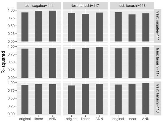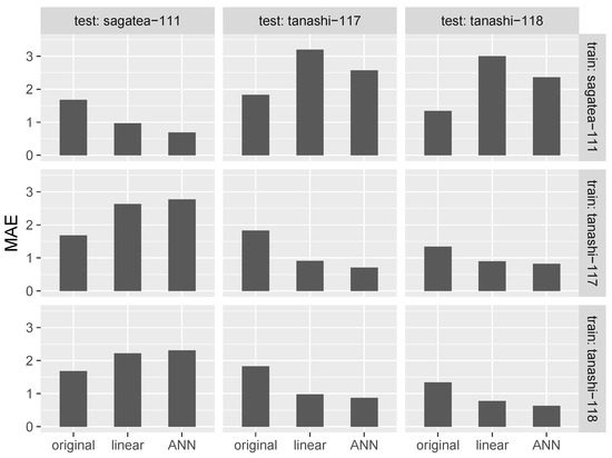 The results of cross-validation are shown in Figure 7 and Figure 8. Diagonal components, for which the training and test locations were the same, represent the results of 10-fold cross-validation within a location. The MAEs and R-squared values were improved by both linear regression-based and ANN-based calibration. ANN calibration performed better at all locations, confirming the effectiveness of our machine learning-based approach.