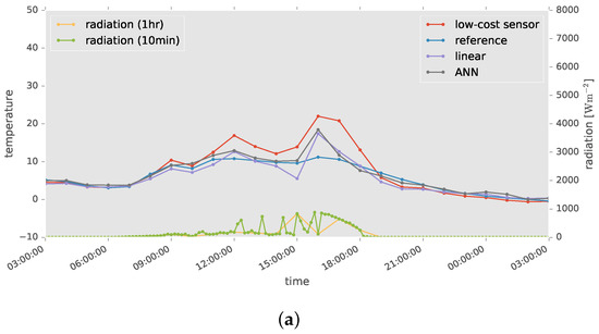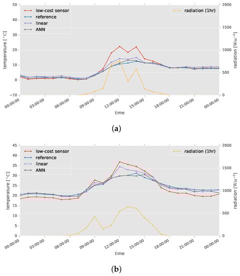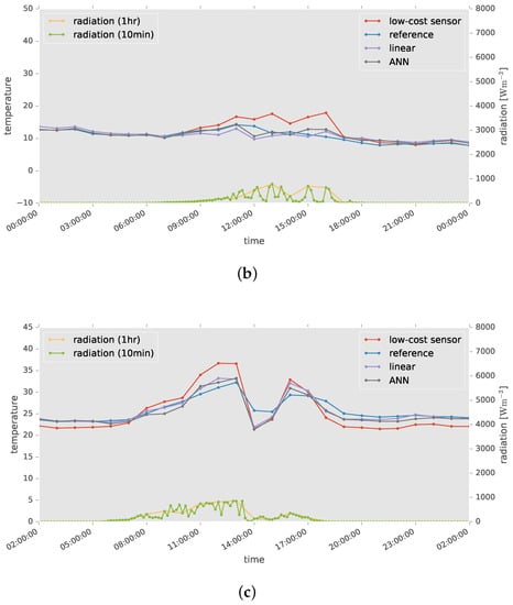The results from the cross-validation within a single location confirmed that the accuracy of the low-cost sensor was considerably improved by the proposed method, compared with the traditional method based on linear regression. However, some large errors occurred, as shown in Figure 11. Some of them are shown in Figure 12. For example, Figure 12a shows solar radiation decreasing rapidly at 16:00, before rising again. This may have been caused by a cloud briefly hiding the Sun. The model decreased the observed temperature by a small amount, as the input solar radiation was also low. On the other hand, in the case of Figure 12b, solar radiation increased rapidly at 12:00, and the observed temperature was therefore greatly decreased by our model. However, as solar radiation had been low between 11:30 and 11:50, the observed temperature was close to the reference value, and the calibration failure shown in Figure 12b occurred. The proposed model used only the environmental conditions of the time when the temperature to be calibrated was observed and did not consider the preceding environmental conditions, which could also cause the observation errors. Therefore, a particularly rapid change of environmental conditions tends to result in the failure of the calibrations. In order to solve the issue, a future study needs to include preceding environmental conditions in the ANN model, discovering the most appropriate period of prior time series observations. We also expect that the higher observation frequency may improve the calibration accuracy.