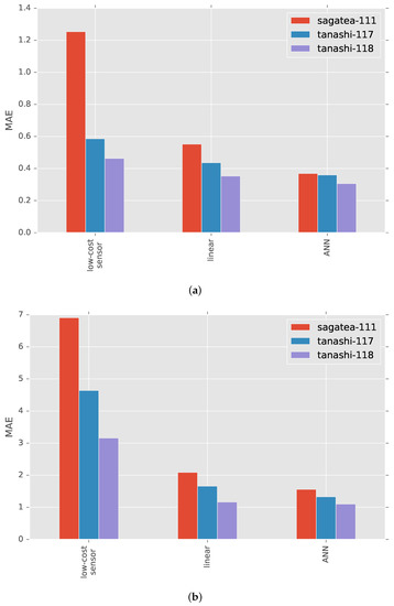 The results from the cross-validation between locations showed that the R-squared values with reference temperature were improved in most cases. The results also showed that MAEs were improved when the data collected in different nearby locations were used. However, negative effects on MAEs arose when data obtained from widely-separated locations were used. The difference in variation at each hour, shown in Figure 13, was considered the possible cause. This difference in variation reflects the different environments of Tokyo and Saga prefectures. For example, the solar radiation at 15:00 in Saga and 16:00 in Tokyo was very similar, but the variation in temperature was clearly different. Our method performed poorly when data obtained from totally different environments were used for training. These results suggest the need to prepare datasets obtained from a range of environments and a dataset measured under similar environments as a test case in practical applications. Even though such data collection requires time and labor costs, long-term cost should be less than using expensive high-accuracy sensors. This is because, once training data are collected at a location, the same model can be applied even when the low-cost sensor is broken and renewed at the location. Our approach also has an advantage over expensive high-accuracy sensors in terms of flexibility; the combination of our approach and low-cost sensors without the forced aspiration system does not require a large amount of electric power, which is often a challenge for use at outdoor sites, but achieves higher accuracy.