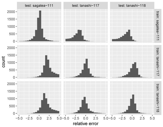 Figure 11 shows the relative error locations. The histograms peak at a relative error of approximately between the locations in Tokyo. The peak becomes more negative or positive for cross-validations conducted at widely-separated locations.