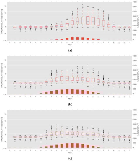 Box plots of differences between air temperatures measured by the high-accuracy and low-cost sensors at different hours. Bar plots represent mean solar radiation in each hour. (a) sagatea-111; (b) tanashi-117; (c) tanashi-118.