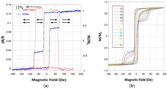 (a) The dependence of magnetization (blue dashed line) and giant magnetoresistive (GMR) ratio (red solid line) on applied external magnetic field for the optimized GMR stack used in this work. The low resistance state corresponds to mutually aligned top and bottom magnetic layers; the high resistance state corresponds to top and bottom layers aligned in opposite directions as indicated with the arrows. The GMR stack has a 13% GMR ratio. The parallel and antiparallel alignment is also exhibited in the M-H loops; (b) the dependence of magnetization on applied external magnetic field for different field orientations with respect to the easy and hard axes orientations. The 0 and 90 degree notations correspond to the hard and easy axes, respectively.