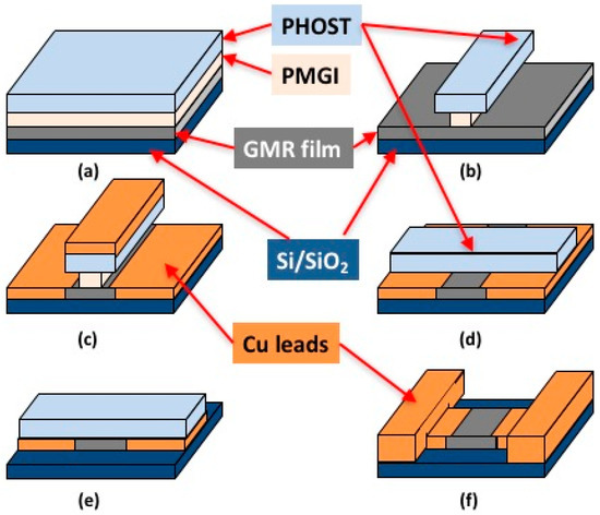 The GMR spin-valve stack was patterned using a combination of optical and e-beam lithography (EBL). Self-aligning processes were employed. The fabrication sequence is illustrated in Figure 3 and described below. First, a 150 nm polymethylglutarimide (PMGI) (MicroChem, Westborough, MA, USA) layer [33] was spin-coated onto the GMR film followed by a one minute UV-ozone treatment to reduce surface hydrophobicity and promote the adhesion of a 500 nm polyhydroxystyrene (PHOST) (Sigma-Aldrich, St. Louis, MO, USA) that was spin-coated next. E-beam lithography (JEOL JBX-5500FS) was used to write 1 μm × 400 nm lines into the PHOST resist [34,35] at a dose of 8500 μC/cm2, where 400 nm defines the length of the sensor (distance between the current leads) and is aligned with the hard magnetization axis in the multilayer (see above). The PMGI/PHOST bilayer system was then developed in propylene glycol monomethyl ether acetate (PGMEA) (Sigma-Aldrich) for 30 s, followed by a 0.88% tetramethylammonium hydroxide (TMAH) (Shipley MF-319) treatment for 50 s to generate an undercut in the PMGI to facilitate lift-off in the later step of forming Cu leads. Wafers were then ion milled under Ar at 500 V, 34 mA for 80 s to remove the unmasked GMR layers. A 70 nm Cu layer was deposited next by magnetron sputtering followed by lift-off in 3% TMAH.