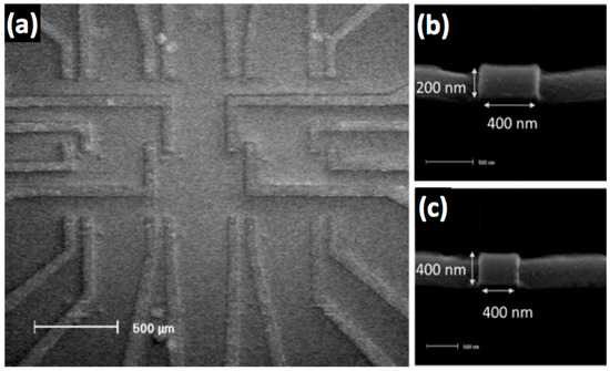 Using the steps detailed above, 12-sensor arrays of 400 nm-long sensors with two different widths, 200 nm and 400 nm, were built. An SEM micrograph of a GMR spin-valve sensor array of twelve sensors is shown in Figure 4a. Zoomed-in SEM micrographs of a 200 nm × 400 nm sensor and a 400 nm × 400 nm sensor in the array are shown in Figure 4b,c, respectively.