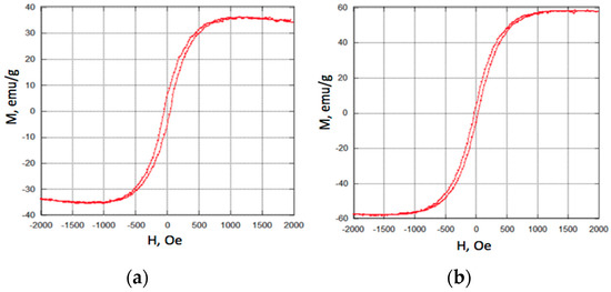 The spinel crystal structure of the synthesized Fe3O4 nanoparticles was confirmed using X-ray diffraction (XRD), and the particle size was measured using scanning electron microscopy. The M-H loops of the both sets of particles are shown in Figure 6. Consistent with previously published data, the larger particles exhibited higher saturation magnetization, likely due to better developed crystallinity [37,38,39]. Both 100 nm and 225 nm particles saturated at approximately 1000 Oe applied field.