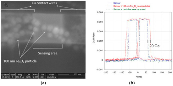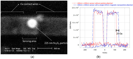 (a) SEM micrograph of several 100 nm Fe3O4 particles deposited on the 400 nm × 400 nm sensing area; (b) GMR profile change of a 400 nm × 400 nm sensor depending on whether several 100 nm Fe3O4 nanoparticles were deposited on the sensing area. The switching field of the sensor covered with the particles increased by ~20 Oe. As the particles were removed, the GMR profile returned to its initial state.