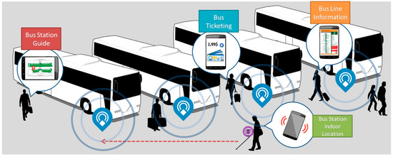 The chosen model meets objectives (1) and (2), but gives special consideration to the safety and convenience of users. Due to the particular distribution of architectural elements in the bus station (columns, etc.) and to prevent positioning errors on mobile devices, a strategy was implemented to deploy BLE beacons near the bus stops with the aim of also providing users with advanced services.