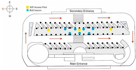 The final area of related studies concerns positioning system proposals for indoor public spaces on public transport networks. In such indoor environments—bus, metro or train stations, shopping centres, etc.—there may be a lot of noise produced by the presence of many people or by humidity. We may mention the study conducted by Ladd et al. [25], in which the system design begins with the observation that the determination of position from complex, noisy and non-Gaussian signals is a well-studied problem in the field of robotics; a robust position estimation to within a metre is achieved in an experimental context. Lin et al. [26] introduced an enhanced indoor location algorithm based on the Redpin algorithm, which matches the received Wi-Fi signal with the signals in the training data and uses the position of the closest training data as the user’s current location. Dickinson et al. [27] introduced a framework for the positioning of users in a large wholesale shopping store, presenting results obtained using different methods of positioning and using RSS measurements. Insoft GmbH [28] has created an app for Swiss Federal Railways (SBB), which helps passengers to find their way through Zurich’s multilevel main station, which occupies a space of approximately 175,000 m2. The app uses more than 1000 Bluetooth beacons and sensor fusion to locate the position of the smartphone.