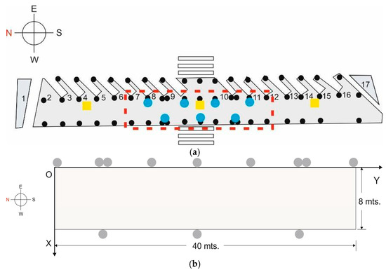 Within the bus station described above, a central section of one of the areas of interest was chosen as the testbed. This is possibly the zone of the station with the greatest difficulty for positioning due to the continuous transit of users and of buses in the surrounding areas. Within the area of interest, we selected a 40 m × 8 m rectangular section. Figure 4 shows the section (marked with a red rectangle) and the chosen origin of coordinates, O, as the reference for the coordinates of the points in the database.