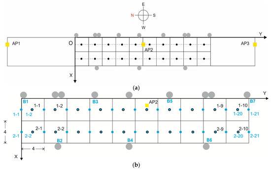 Grid chosen in the testbed: (a) in relation to the 3 Wi-Fi APs; (b) detail showing the reference points of the Wi-Fi and BLE databases and the arrangement of the BLE beacons.