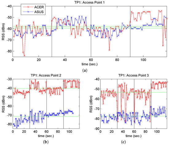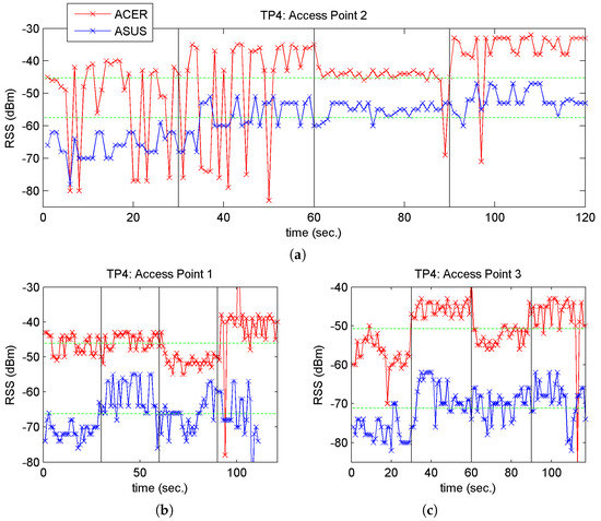 The observations in Figure 8a,c were also true for the other TP points. In relation to the phenomenon described in Figure 8b, the same occurred with the other TP points and their corresponding nearest access point. For example, in the case of point TP4, as it is located near AP2, the mean RSS values are very close, as may see in Figure 8.