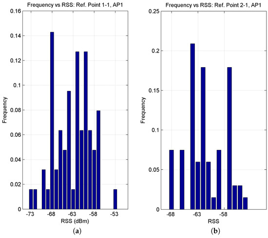 RSS histograms for AP1 at reference points (a) 1-1 and (b) 2-1.