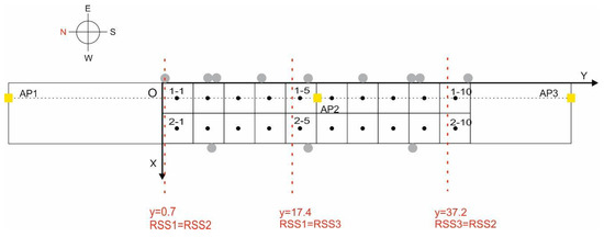 The geometric arrangement of the 3 access points, mentioned in Section 3.2, led us to study its possible influence on the Wi-Fi positioning results: within the testbed and under LOS conditions we calculated the three straight lines parallel to the X axis of points at an equal distance between 2 pairs of access points. This was to enable us to determine the areas within the testbed with the highest RSS values.