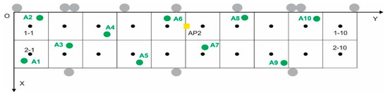 Figure 10 shows the result of this calculation. Due to the relative configuration between the testbed and the AP distribution, it is interesting to note that AP2 has the greatest influence on most cells of the grid, i.e., theoretically and under LOS conditions, the order of the mean RSS values in the grids should be as follows: