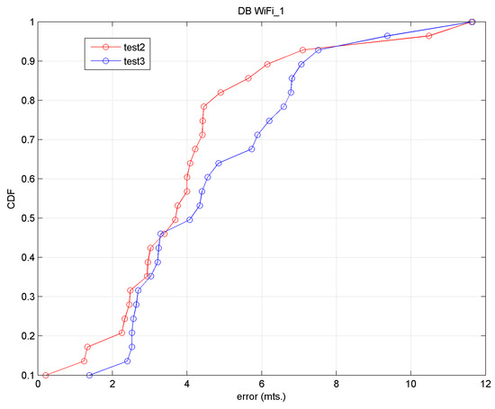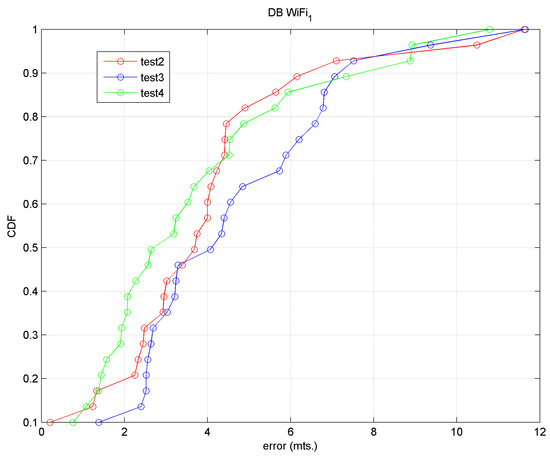 In all the Wi-Fi tests, measurements were taken at reference points spaced every 4 m. The first took into account the orientation of the user, the online phase of which described a scenario very close to reality as it took only three samples of the signal from each access point. Two orientations presented better results than the other two, probably due to the arrangement of the access points with respect to the person measuring the data, who screens the signal coming from these access points. For the most favourable orientation, and compared with four neighbours, an average accuracy of 4.44 m and a precision of less than 5.21 m 90% of the time were obtained. In the second and third tests, the user orientation effect was eliminated, producing, respectively, an accuracy of 4.13 and 4.82 m compared to two neighbours. The precision of the two tests was less than 4.0 m 50% and 60% of the time, respectively. In the fourth and final test, the mean orientations were taken and Spearman’s rank correlation coefficient was used to compare reference and target fingerprints, obtaining by comparison with two neighbours an accuracy of 3.94 m and a precision of less than 4 m almost 70% of the time.