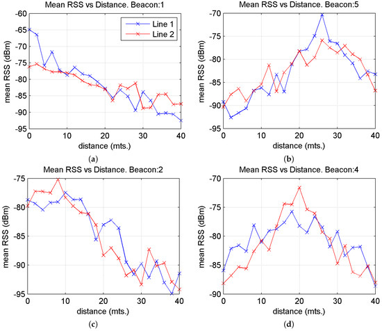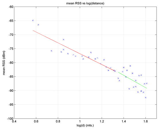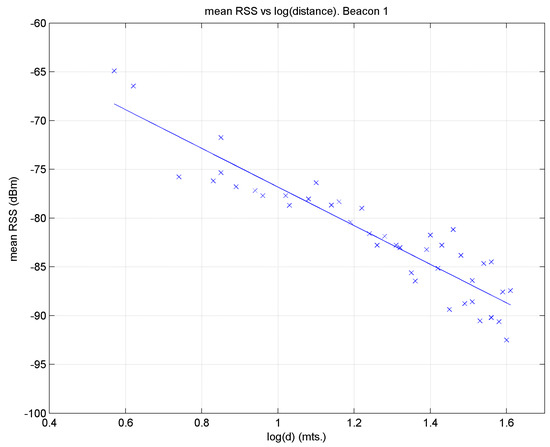 One drawback of this method is that a regression line with a single slope may not correctly reflect the propagation characteristics near or far from a beacon, as these characteristics may be very different in the two zones; this would lead to sizeable errors when estimating distance, especially at remote target points. This behaviour may be observed in Figure 15 for distance logarithm values between approximately 1.4 and 1.6. To fit the model better, two regression lines could be used; for example, in relation to Figure 15, one for points to the left of the break-point (which in this case would be close to 1.4) and another for the rest, where this point would be determined empirically [29,33].