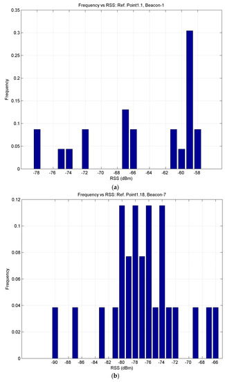 Histograms of RSS values for two beacons: (a) Beacon 1 in the absence of passengers; (b) Beacon 7 in the presence of passengers.