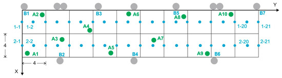 The empirical approach followed was similar to that followed with Wi-Fi [34]. In this case, however, a grid of 22 cells, each measuring 2 m × 2 m with a density of 14.5 fingerprints per m2, was chosen initially (later increased to 42 cells), and seven BLE beacons were deployed (see Figure 5). For these tests, the configuration of each beacon was not very cost-effective in terms of battery consumption: at a frequency of 50 Hz and with an output power of 0 dBm.