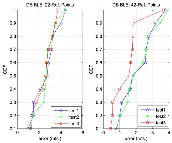 Precision (CDF) for Test 1, 2 and 3 with: (a) 22 and (b) 42 reference points.