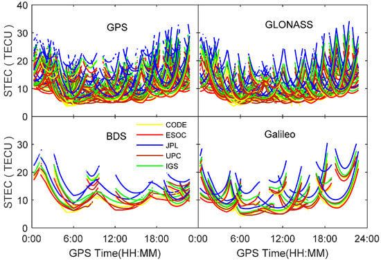 In order to compare the GIM products generated from different agencies, the TEC along the line of sight at each ionospheric pierce point of satellite signals are computed using datasets at station PFRR on 4 September 2016 by applying Equations (6) and (7). Figure 1 shows the derived slant TEC (STEC) for all visible satellites from different constellations. It can be seen that there exist obvious offsets for GIM products provided by different agencies, although their varying trend is quite consistent. The largest TEC discrepancy is up to 10.5 TECU for GIM products provided by JPL and ESOC. In order to assess the GIM products, the dual-frequency observations from four constellations are utilized to derive the line-of-sight TEC of each satellite as references. The DCBs at both satellite and receiver ends are corrected using the multi-GNSS DCB products to obtain absolute TEC values. For further comparison, the CAS and DLR quad-constellation DCB products are employed, respectively. Figure 2 shows the RMS statistical values of the slant TEC derived from different agencies’ GIM and DCB products. As seen from the two figures, the CODE GIM products achieve the highest accuracy in terms of the RMS values. Comparing the white bars and the color bars for each constellation, it is explicit that the DLR DCB products slightly outperforms the CAS DCB products. Based on this analysis, the CODE GIM products and the DLR multi-GNSS DCB products are, therefore, adopted in our study.