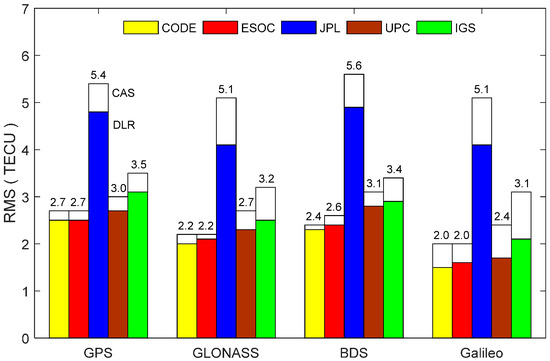 RMS statistical values of slant TEC derived from different GIM products based on the CAS (white bar) and DLR (color bar) multi-GNSS DCB corrections.