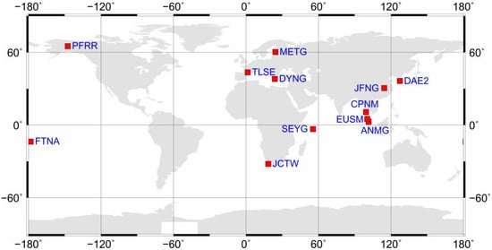 Quad-constellation observation datasets collected from 12 globally-distributed MGEX stations, as well as the CODE GIM products and the DLR multi-GNSS DCB products on 4–10 September 2016 are used to assess the performance of the proposed single-frequency PPP approach. The distribution of stations is shown in Figure 3. All observations have a sampling rate of 30 s. In the PPP processing, the satellite elevation mask angle is set to 10°. The quad-constellation mixed satellite orbit and clock products provided by CODE are used at sampling intervals of 15 min and 5 min, respectively. Since the precise coordinates of most stations are not available, their coordinate values are computed at the precise millimeter level through an Online Positioning User Service (OPUS) that is developed by the United States’ National Geodetic Survey [24]. The OPUS processing results also refer to “IGS08”, which is consistent to the coordinate reference of the PPP solutions.