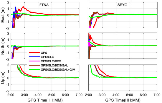 In order to evaluate the proposed single-frequency PPP approach, the datasets at FTNA and SEYG stations on 5 September 2016 are processed in five different scenarios i.e., GPS, GPS/GLONASS, GPS/GLONASS/BDS, GPS/GLONASS/BDS/Galileo, and GPS/GLONASS/BDS/Galileo plus GIM.