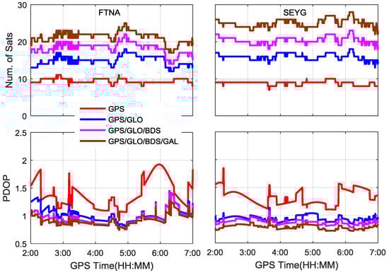 Number of satellites and PDOP for different PPP processing scenarios using datasets at FTNA and SEYG stations on 5 September 2016.