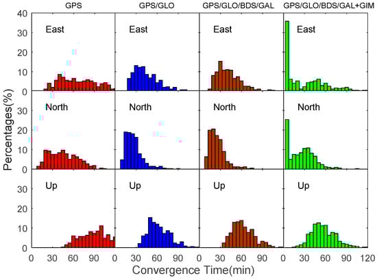 In order to assess the convergence time of our proposed single-frequency PPP approach, the convergence time of GPS-only PPP, GPS/GLONASS PPP, and GPS/GLONASS/BDS/Galileo PPP are compared with the quad-constellation GNSS plus GIM PPP using datasets collected at twelve MGEX stations over seven consecutive days during 4–10 September 2016. In this study, the position filter is considered to have converged when the absolute values of the positioning errors in the horizontal directions reach 0.3 m and keep within 0.3 m. Given that the PPP errors in the height component are relatively larger than its horizontal components, the convergence criterion in the vertical directions is enlarged to 0.5 m. The convergence time is the period from the first epoch to the converged epoch. For each day, datasets are divided into five-hour sessions to ensure convergence of position solutions so each day includes four complete sessions. Datasets in each session are processed independently. As the DYNG dataset on 5 September 2016 is missed, a total of 332 sets of results are obtained to derive a statistical estimate on the convergence time as well as the positioning accuracy. The distribution of the 332 sets of convergence time in the east, north and up components is plotted in unit of minutes in Figure 6. It is visible that the GPS/GLONASS combination distinctly reduces the convergence time over the GPS-only PPP. This convergence time is further reduced in the quad-constellation PPP, but to a slight degree. In conjunction with the GIM data, the convergence time is significantly decreased especially in the horizontal directions. Using our proposed single-frequency PPP approach, the horizontal position solutions accounting for over 25% can converge within 5 min. The reason why the convergence performance can be improved after the GIM data is introduced is because the correlations among parameters of the IHD, receiver clock offset and ambiguities are decreased. The vertical direction is more sensitive to the ionospheric errors. As a result, the improvement in the vertical direction is less significant than the horizontal directions due to the limited accuracy of the GIM data.