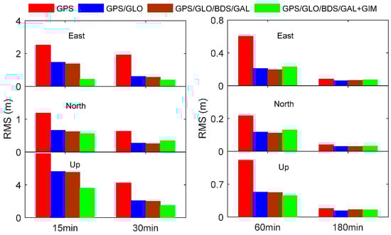 RMS statistics of positioning errors for different single-frequency PPP processing scenarios at the end of 15 min, 30 min, 60 min, and 180 min.