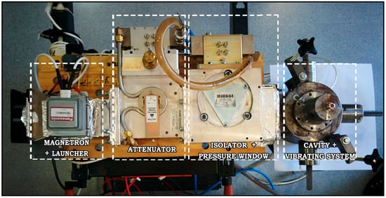 As Figure 1 shows, the developed prototype is formed by the Muegge (Mod. MX1000C-112KL, Reichelsheim, Germany) power supply, offering a precise continuous control of the heating power, which has been programmed using MATLAB®; the 1 kW standard component (Panasonic Mod. 2M244-M23, Osaka, Japan) magnetron, which transforms the electrical energy into microwave electromagnetic energy; the launcher to transmit the energy of the magnetron to the heating system; the (GAE GA1118, Reichelsheim, Germany) attenuator to adapt the microwave power to the 3 mL food samples; the isolator, implemented using a circulator Muegge (Mod. MM1003A 210EC), in order to protect the magnetron by deviating the reflected microwave energy to be dissipated by means of a water load, with a connection to include an incoming power detector; and, finally, the resonant cylindrical cavity, whose height is 4.34 cm, and diameter is 13.4 cm.